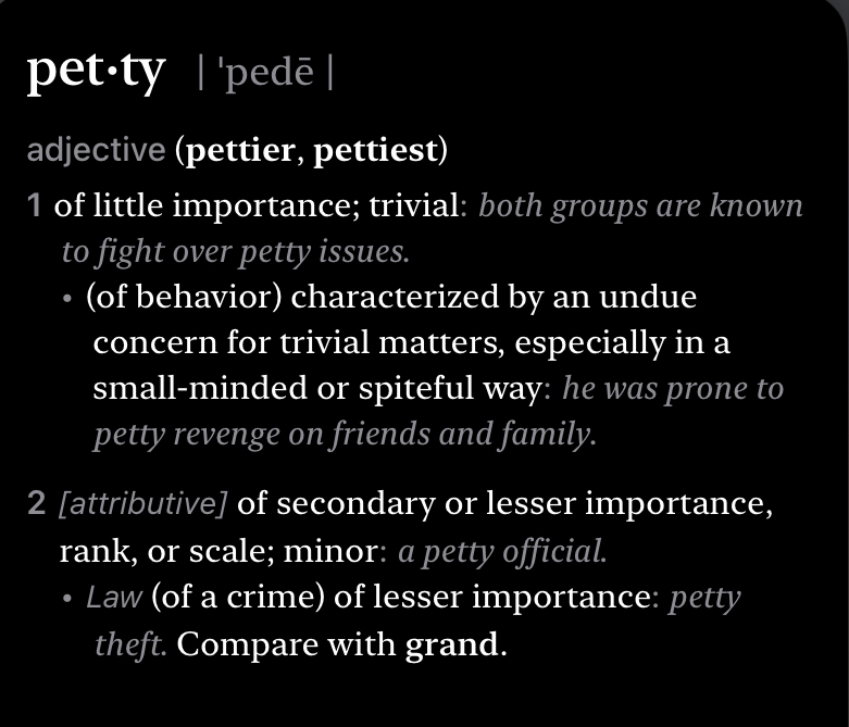 “Petty” means something unimportant, trivial. Minor. Lesser.